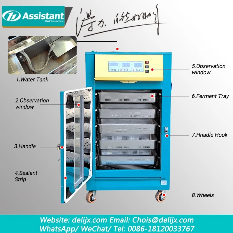 Tangki air dengan alat penyemprot dipasang di bagian atas, dan kabut air yang diatomisasi secara alami mengisi bagian dalam mesin fermentasi teh, dan fermentasi lebih seragam.